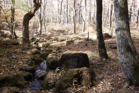 第4話で鳥居治が以前クーナを見た場所に行く為に森の中を歩いているシーンで使われた森です。ドラマは夏から秋にかけて撮影されたので、とても緑が綺麗ですが、この写真を撮影した11月初旬には、緑はほとんどありません。ペンションからは車で30分程の茅野市の山の中にあります。