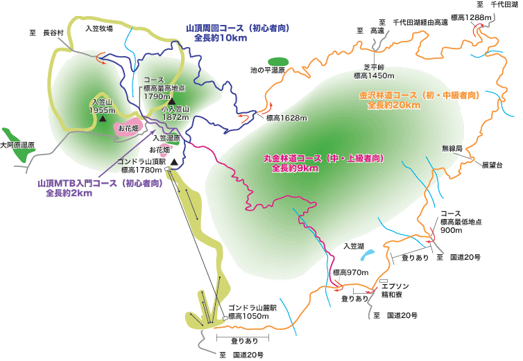 ゴンドラ山頂よりスタートする登りを含む林道です。各コースからは南・中央・北アルプス、八ヶ岳、富士山など日本を代表する山々を一望する事ができます。また、周辺には多くの高山植物や湿地など高山特有の大自然が広がっています。コースも上級から初心者まで多くのコースがあり、どんなレベルの方でも楽しむことができます。家族連れでお弁当を持ってマウンテンバイクをするのも良いでしょう。是非パノラマリゾートで最高のマウンテンバイクライドを!!