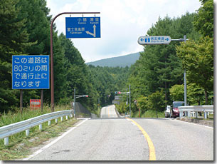 ここを右に曲がります。約1kmほどで左手にローソンが現れます(ラクーンから一番近いコンビニです。、ラクーンまで約5km)。このローソンを通り過ぎひたすら道なりに登っていきます。 途中に信号が1つありますがここも通過します。ローソンを過ぎて2.3kmほど行くと大平(おおだいら)という2つめの信号機があります。そこを左折して富士見高原方面に進みます。(左側に「直進は清里、左折は富士見高原」を示す道路案内があります。)左折してから2.7kmで富士見高原ペンションビレッジの入り口に到達します。 2001年10月以降、有料道路の無料化に伴い、料金所はなくなりました。通り過ぎないようにお気をつけください。