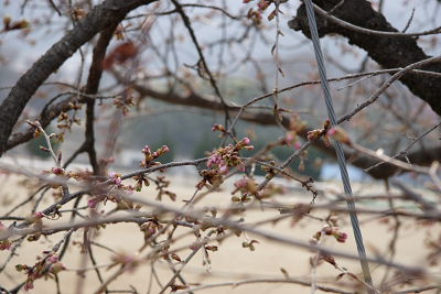 こちらもピンク色のつぼみが見る事が出来ます。だんだんと膨らんできて、1週間ちょっとで開花時期に迫ってくるのでは?と思っています。 こちらは、韮崎工業高校の校庭にある桜です。開花が始まっている場所もありました。2004年3月26日の写真を見ると、これよりも少しだけ多く咲いている写真が掲載してあったので、2004年と比べても同時期か少しだけ早い桜の開花が見込まれると思います。2004年は神代桜は3月30日頃に開花でした。