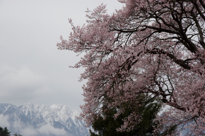 王仁塚の桜 韮崎にある王仁塚の桜は、山高の神代桜とは同時期に開花して、満開時期も同じなのですが、今年少し遅れ気味です。満開の神代桜に対して、こちらは8分咲きと言った感じでしょうか?ただし、この時期の王仁塚の桜はとてもピンク色が濃いのでラクーンとしてはこのくらいの時期が一番のおすすめです。王仁塚の桜も満開になると退色がはじまり白くなっていきます。 |